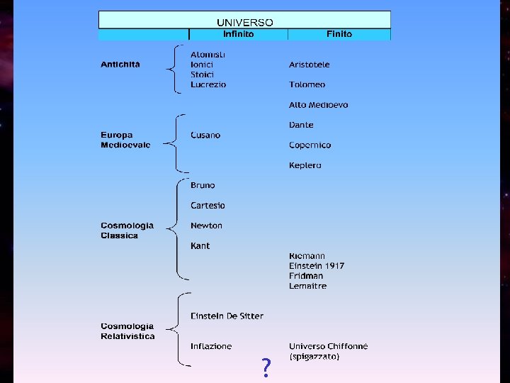 Finito o Infinito? • Nel corso della storia diversi filosofi si sono posti il problema dell'origine e dell'evoluzione dell'universo. • Passando dall’infinito dei Presocratici al finito di Aristotele i filosofi greci hanno compiuto la prima tappa essenziale. • Nel XVII secolo l’evoluzione si è svolta nel senso opposto il passaggio dal mondo chiuso all’Universo infinito è stato consacrato da Newton (Identificato con lo spazio euclideo infinito) • L'ipotesi di una pluralità di universi-isola, fù invece postulata per la prima volta nel 18° secolo da E. Kant, secondo il quale il sistema solare era contenuto in un immenso contenitore di stelle (la Via Lattea), che insieme ad altre analoghe strutture popolavano l'intero cosmo. • La teoria della Relatività (Einstein) offre un nuovo decisivo quadro per la comprensione dell’Universo (Spazio -Tempo curvato dalla materia)
