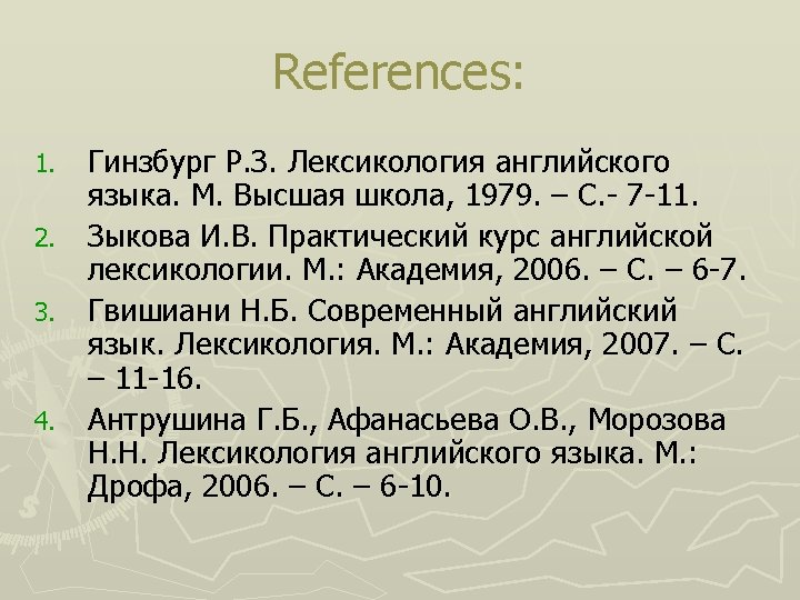Conclusion 1. 2. 3. 4. A slight change in the morphemic or phonemic composition of a word is not connected with any modification of its meaning. A change in meaning is not followed by any structural changes, either morphemic or phonemic. Like word-forms variants of words are identified in the process of communication as making up one and the same word. Within the language system the word exists as a system and unity of all its forms and variants.