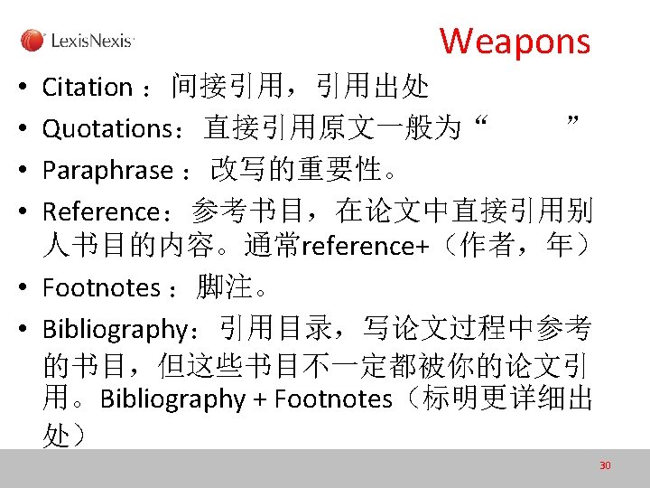 Process 1、Learn your paper topic as soon as possible to help plan your research 尽快熟悉分析题目 2、Find research information from a wide variety of sources including journal articles, books, encyclopedias, and news sources. 尽可能广泛去搜寻题目相关学术资料(充分利用Lexis去做 到这一步) 3、Skim through your sources to separate the interesting research from the irrelevant material. 缩小资料范围,剔除无关资料 (也可利用检索式在Lexis里 做到) 4、Reading 阅读 5、Writing 写作 6、Review 自我检查 31