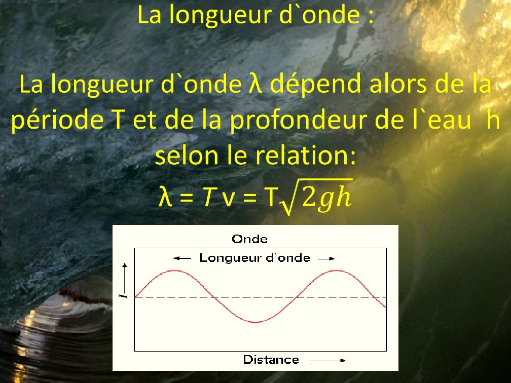 Au fur et à mesure que la vague avance: -son amplitude augmente => au moment ou elle déferle, elle est tres grande, mais on ne peut pas la percevoir au large -on constate également une diminution de la longueur d`onde et de la vitesse en milieu lorsque la profondeur diminue