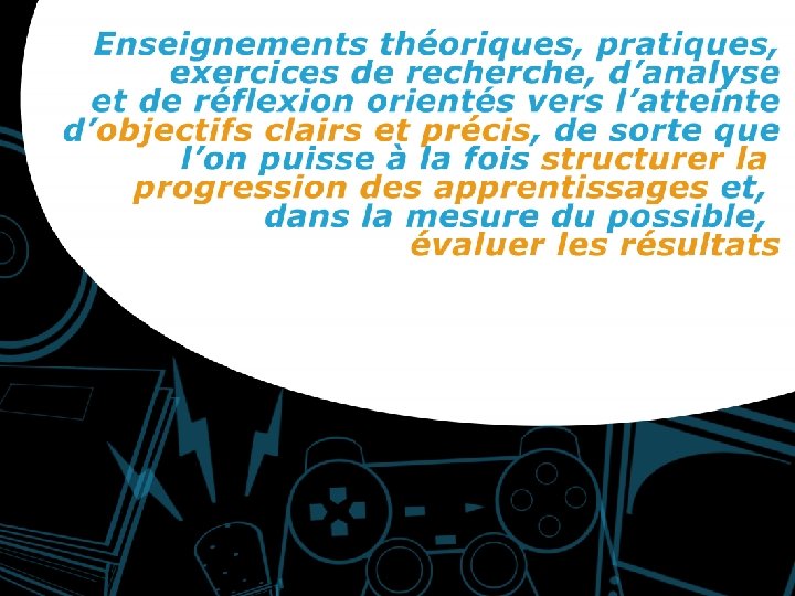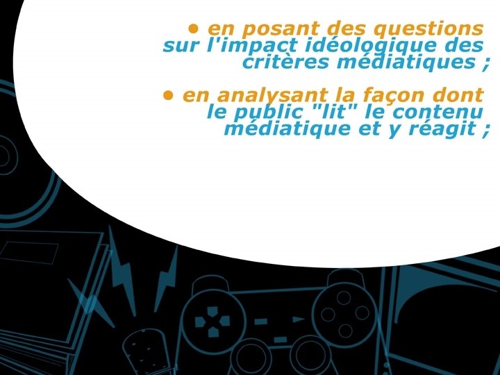 « Nos objectifs peuvent varier selon la nature des projets, mais ils doivent concerner la totalité des aspects de l'univers médiatique: la réception et le contenu des messages, la création, la production, la diffusion et la transmission des contenus. » (Laramée, 1982)