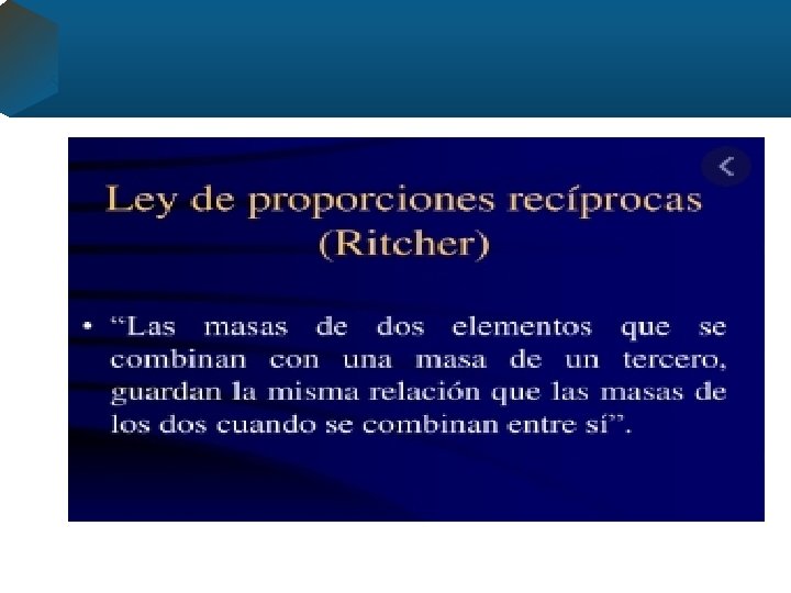 • La Ley de las propiedades recíprocas o Ley de Richter establece que “las masas de dos elementos que se combinan con la masa de un tercero conservan la misma proporción que las masas de los dos cuando se combinan entre sí. Esta Ley puede considerarse como una consecuencia de la ley de las proporciones definidas, o ley de Proust, y de las propiedades aritméticas de las proporciones.
