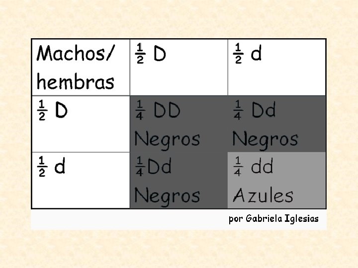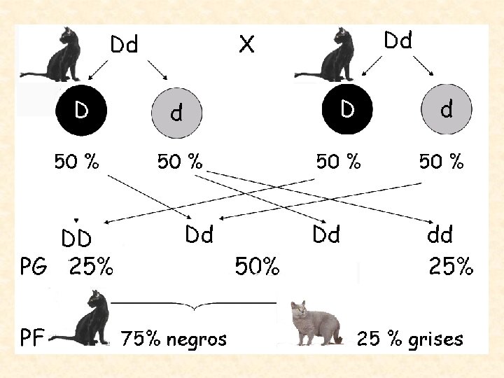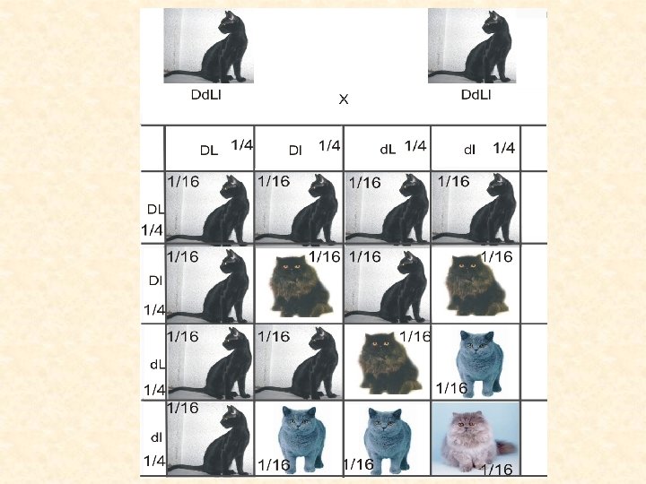 Diagrama de Punnet Machos Hembras 1/4 DL 1/4 Dl 1/4 d. L 1/4 dl 1/4 DL 1/16 DDLl 1/16 Dd. LL 1/16 Dd. Ll 1/4 Dl 1/16 DDLl 1/16 DDll 1/16 Dd. Ll 1/16 Ddll 1/4 d. L 1/16 Dd. Ll 1/16 Ddll 1/16 dd. LL 1/16 dd. Ll 1/16 ddll 1/4 dl