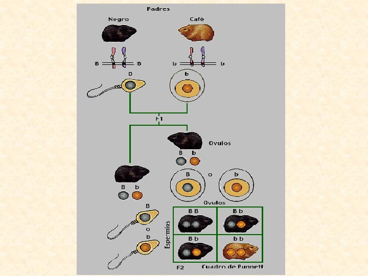 Gen amarillo Machos Yy (amarillos) X Hembras Yy (amarillos) Gametas ½Y ½y ½Y ¼ Letal ¼ Yy Amarillo ½y ¼ Yy Amarillo ¼ yy Agutí PG 1/4 YY: 1/2 Yy: 1/4 yy 25 % mueren, 50 % amarillos, 25 % agutíes