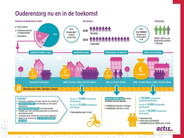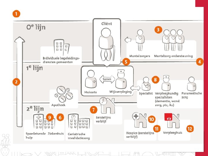 En als het niet lukt om terug naar huis te gaan? • Eerstelijns verblijf (tijdelijk) hoog complex SO + behandelaar laag complex Huisarts • Verpleeghuis/zorgcentrum • Hospice