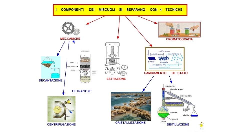 CLASSIFICAZIONE DELLE TECNICHE v PER SISTEMI OMOGENEI: v PER SISTEMI ETEROGENEI: § Estrazione (diversa solubilità) § Decantazione (diversa densità) § Distillazione (diversa volatilità) § Filtrazione (diversa dimensione) § Cromatografia (ripartizione tra le fasi) § Centrifugazione (diversa densità) § Cristallizzazione (diversa solubilità)