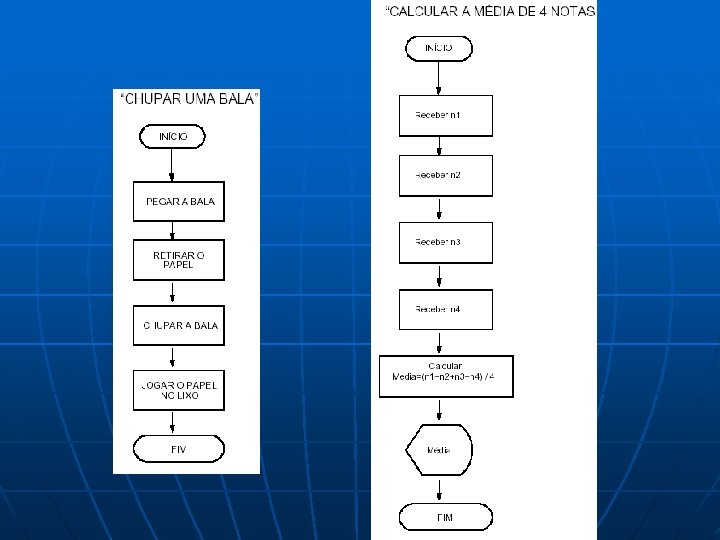 Exemplo de algoritmo n “Chupar uma bala” • • Pegar a bala Retirar o papel Jogar o papel no lixo Chupar a bala n Pode-se escrever este algoritmo de outra forma? n Como ficaria se o pote de balas tivesse balas de diversos sabores?