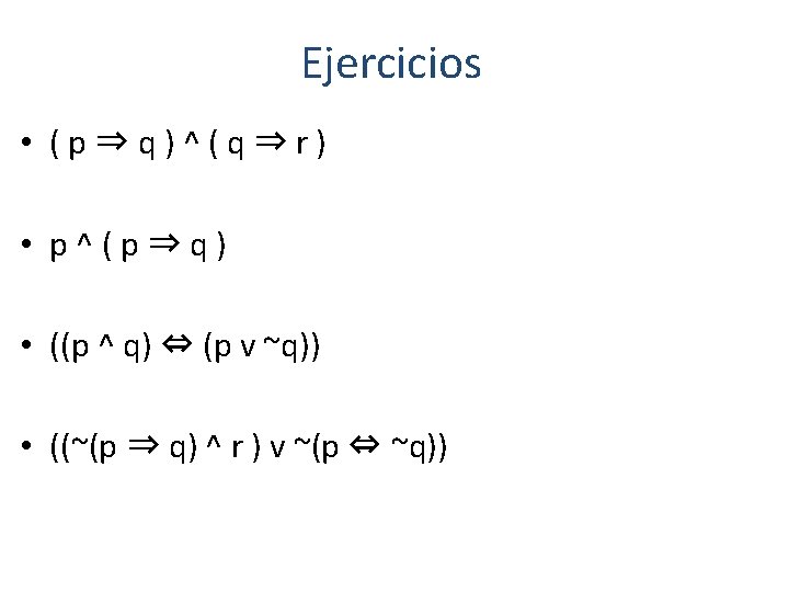 Lógica Proposicional • Simplificar ~ usando las equivalencias: ~( ~p ) ≡ p ~( p v q ) ≡ ~p ^ ~q ~( p ^ q ) ≡ ~p v ~q • Finalmente, aplicar la ley distributiva donde sea necesario. pv(q^r)≡(pvq)^(pvr)