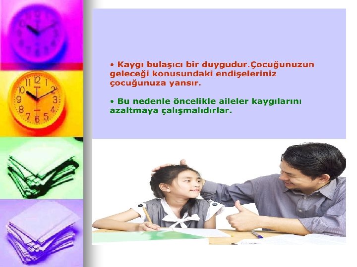 * Çocuğunuzdan beklentilerinizde gerçekçi olmaya çalışın. * Örneğin sözel dersleri sayısaldan daha iyi olan bir öğrenciye “fen lisesi kazanmalısın, doktor olmalısın” şeklinde baskı yapılmamalıdır. • Beklentileriniz ile çocuğunuzun yapabilecekleri birbiriyle uyumlu olursa çocuğunuz daha az kaygı yaşayabilir.