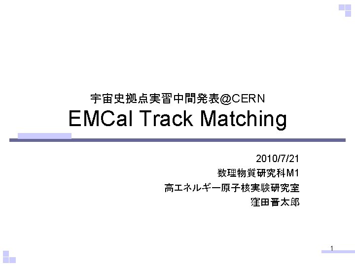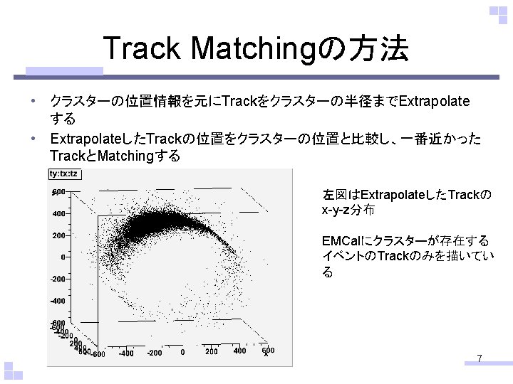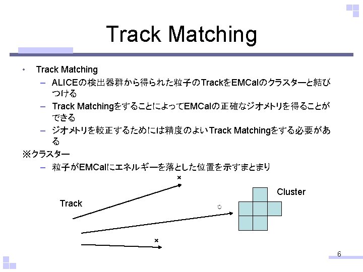 LHCALICE ALICE EMCal Track Matching Track Matching Track Slides: 16 Download presentation 目次 • LHC-ALICE実験 – ALICE検出器 • EMCal • Track Matching – Track Matchingの方法 – Track Matching – クラスターによるカット • 今後の課題 2 ALICE検出器 4 Track Matching • なにもカットをかけていないdphi vs p. T、deta vs p. T Dphi vs p. T 赤:正電荷 青:負電荷 Deta vs p. T 12 14 15 • • • cphi: 1. 4114 ceta: -0. 381278 cx: 69. 5317 cy: 432. 516 cz: -171. 103 cluster. R: 438. 07 • • • i. Cluster: 1 i. Track: 0 emcpos: 418. 699, -116. 199, -189. 628 i. Cluster: 1 i. Track: 1 emcpos: 232. 326, 369. 665, 283. 617 i. Cluster: 1 i. Track: 2 emcpos: 323. 497, -293. 163, -180. 193 i. Cluster: 1 i. Track: 3 emcpos: -269. 164, 338. 755, -328. 127 i. Cluster: 1 i. Track: 4 emcpos: 359. 201, -242. 878, -233. 396 i. Cluster: 1 i. Track: 5 emcpos: -184. 337, -393. 181, 189. 966 i. Cluster: 1 i. Track: 6 emcpos: 396. 364, -178. 51, -36. 4944 i. Cluster: 1 i. Track: 7 emcpos: -216. 225, -381. 575, -504. 559 i. Cluster: 1 i. Track: 8 emcpos: 433. 235, -33. 7623, -42. 4475 … i. Cluster: 1 i. Track: 138 emcpos: 342. 907, -264. 735, -567. 469 • mintphi: 1. 45627 minteta: -0. 290033 mindphi: 0. 0448746 mindeta: 0. 0912447 ←クラスターの位置情報 ←Extrapolationした Trackの位置情報 ↓一番クラスターに近かったTrack 16