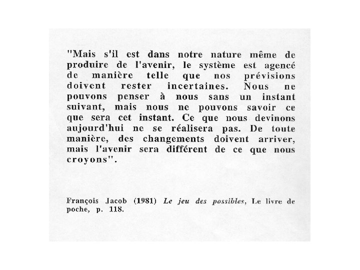 « La hiérarchie dans la complexité des objets a donc deux caractéristiques: d’une part, les objets qui existent à un niveau donné ne forment jamais qu’un échantillon limité de tous les possibles offerts par la combinatoire du niveau plus simple. D’autre part, à chaque niveau peuvent apparaître de nouvelles propriétés qui imposent de nouvelles contraintes aux systèmes. Mais ce n’est jamais qu’un surcroît de contraintes. Celles qui existent à un niveau donné s’appliquent aussi aux niveaux plus complexes. Toutefois, le plus souvent, les propositions qui ont le plus d’importance à un niveau n’en ont aucune aux niveaux plus complexes. La loi des gaz parfaits n’est pas moins vraie pour les objets de la biologie que pour ceux de la physique. Seulement elle n’a aucun intérêt pour les questions qui préoccupent les biologistes » . François Jacob (1981) Le jeu des possibles (Paris: Le livre de Poche, p. 59)