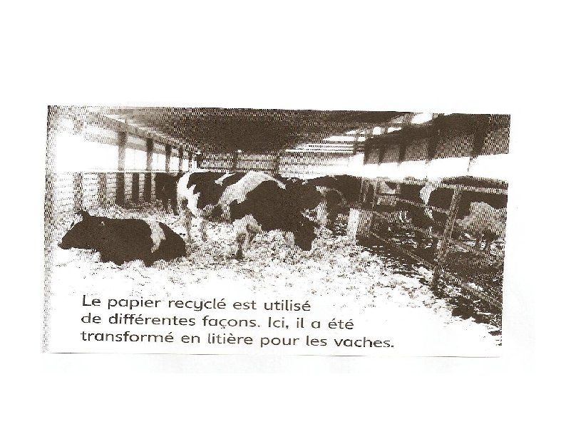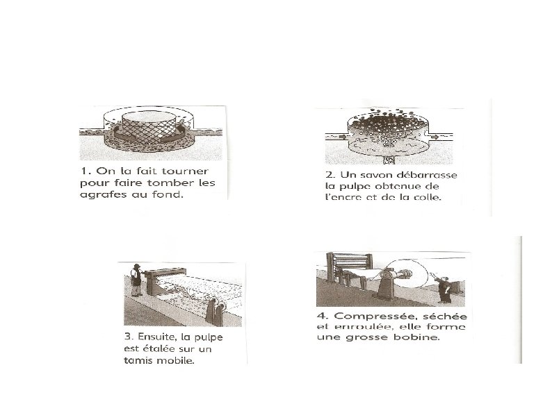 RECYCLAGE DU PAPIER CARTON Pour recycler le papier, on le mélange à de l'eau pour obtenir une pulpe pâteuse qui passe ensuite par différentes étapes. 1) On le fait tourner pour faire tomber les agrafes au fond. 2) Un savon débarrasse la pulpe obtenue de l'encre et de la colle. 3) Ensuite, la pulpe est étaler sur un tamis mobile. 4) Compressé puis sécher et enrouler, elle forme une grosse bobine. Le papier recyclé est utilisé de différentes façons. -En litière pour les vaches. -On peut recycler le papier plusieurs fois, en obtenant un nouveau produit à chaque fois. Une bobine de papier recyclé fournit 80 000 rouleaux de papier toilette.