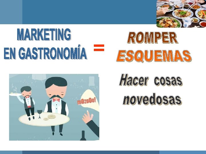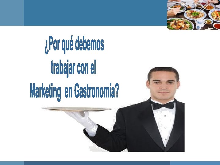 ¿QUE ES EL MARKETING EN GASTRONOMIA? Actividad orientada a: Ø Identificar necesidades y deseos del usuario y tratar de satisfacerlos. Ø Conceptualizar tales necesidades en función de la capacidad de la empresa. Ø Comunicar dicha conceptualización a quienes tienen la capacidad de toma de decisiones en la empresa para la ejecución.