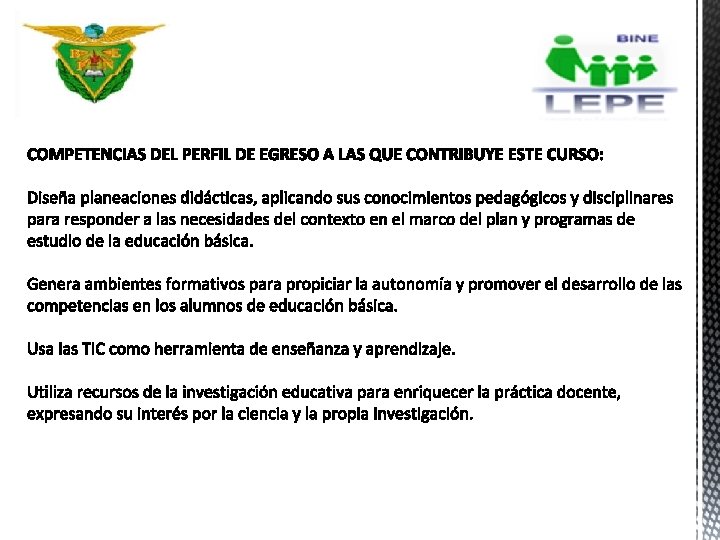 COMPETENCIAS DEL CURSO: Explora la situación ambiental local, nacional y global desde una perspectiva holística, para ubicar la responsabilidad que corresponde a la escuela y al docente en su atención. Desarrolla prácticas escolares sustentables para contribuir a la preservación de los recursos naturales y la prevención de los problemas ambientales. Identifica la estructura, principios y tendencias de la educación ambiental para la sustentabilidad para fundamentar y potenciar su aplicación en la vida cotidiana, así como para situar sus propuestas educativas. Elabora y difunde material a favor del medio ambiente utilizando diversos recursos de comunicación pertinentes a la naturaleza de los mensajes y a los destinatarios. Diseña situaciones didácticas que propician el mejoramiento y desarrollo personal, socio-cultural y ambiental, generando en sus alumnos una actitud de respeto a la diversidad biológica y cultural.