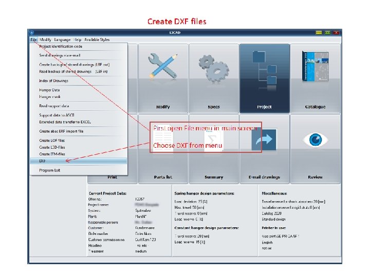 LICAD 10 • • • Choose menu language Design of hanger support Setup specifications Setup project properties Create DXF files Create summary parts list