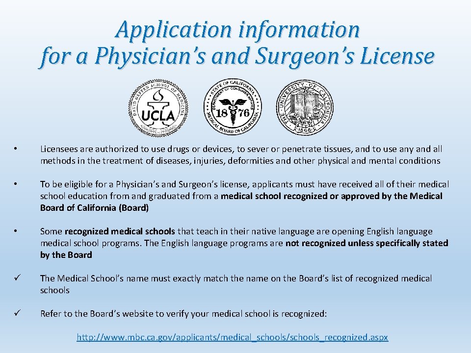 Application information for a Physician’s and Surgeon’s License • Licensees are authorized to use drugs or devices, to sever or penetrate tissues, and to use any and all methods in the treatment of diseases, injuries, deformities and other physical and mental conditions • To be eligible for a Physician’s and Surgeon’s license, applicants must have received all of their medical school education from and graduated from a medical school recognized or approved by the Medical Board of California (Board) • Some recognized medical schools that teach in their native language are opening English language medical school programs. The English language programs are not recognized unless specifically stated by the Board ü The Medical School’s name must exactly match the name on the Board’s list of recognized medical schools ü Refer to the Board’s website to verify your medical school is recognized: http: //www. mbc. ca. gov/applicants/medical_schools/schools_recognized. aspx
