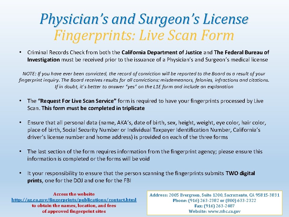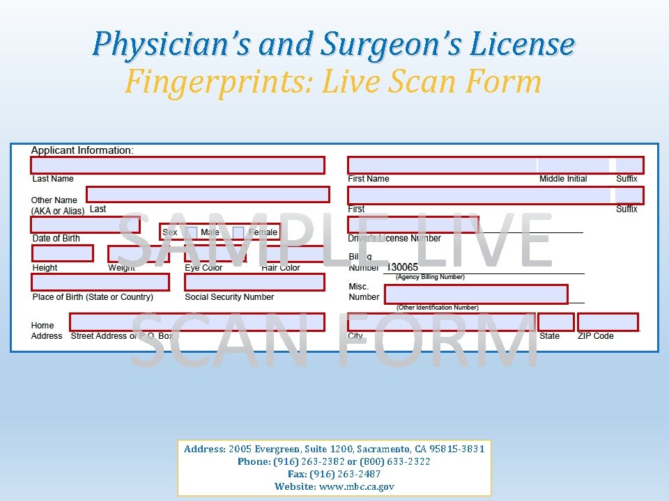 Physician’s and Surgeon’s License Fingerprints: Live Scan Form Address: 2005 Evergreen, Suite 1200, Sacramento, CA 95815 -3831 Phone: (916) 263 -2382 or (800) 633 -2322 Fax: (916) 263 -2487 Website: www. mbc. ca. gov