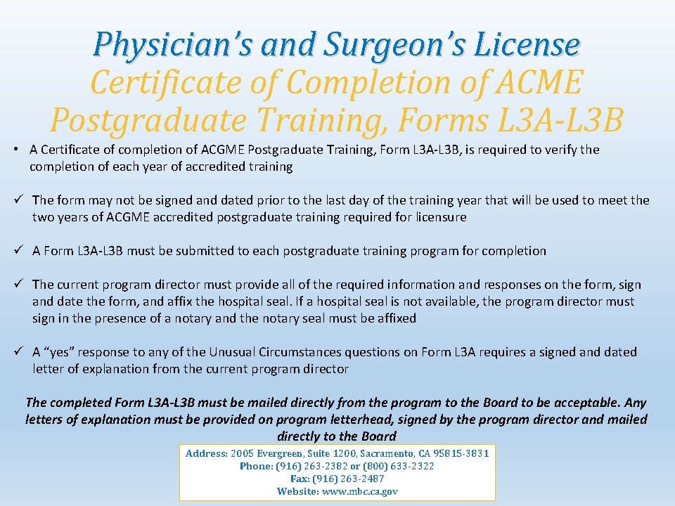 Physician’s and Surgeon’s License Certificate of Completion of ACME Postgraduate Training, Forms L 3 A-L 3 B ✓ Address: 2005 Evergreen, Suite 1200, Sacramento, CA 95815 -3831 Phone: (916) 263 -2382 or (800) 633 -2322 Fax: (916) 263 -2487 Website: www. mbc. ca. gov