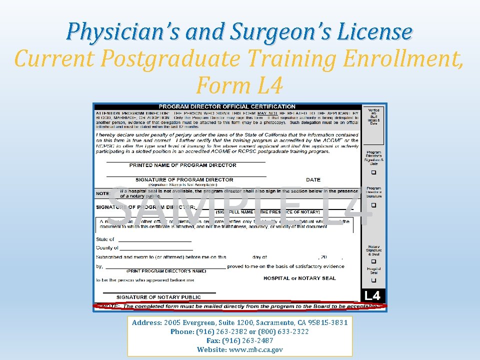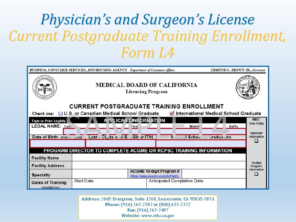 Physician’s and Surgeon’s License Current Postgraduate Training Enrollment, Form L 4 ✓ Address: 2005 Evergreen, Suite 1200, Sacramento, CA 95815 -3831 Phone: (916) 263 -2382 or (800) 633 -2322 Fax: (916) 263 -2487 Website: www. mbc. ca. gov