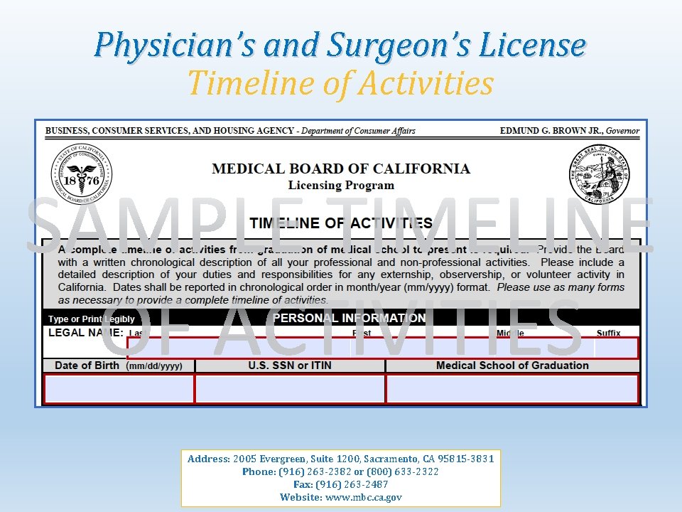 Physician’s and Surgeon’s License Timeline of Activities • A complete timeline from the graduation of medical school to present is required. • Provide the Board with a written chronological description of all your professional and non-professional activities with no gaps. • If you have completed any externships, observerships, or volunteers activities in California, please include a detailed description of your duties and responsibilities along with the location and name of the supervising physician. Mail your signed and dated timeline of Activities form directly to the Board Address: 2005 Evergreen, Suite 1200, Sacramento, CA 95815 -3831 Phone: (916) 263 -2382 or (800) 633 -2322 Fax: (916) 263 -2487 Website: www. mbc. ca. gov
