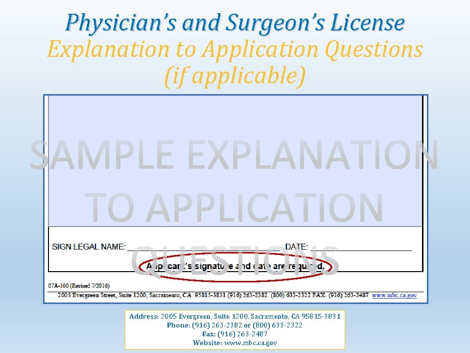 Physician’s and Surgeon’s License Explanation to Application Questions (if applicable) Address: 2005 Evergreen, Suite 1200, Sacramento, CA 95815 -3831 Phone: (916) 263 -2382 or (800) 633 -2322 Fax: (916) 263 -2487 Website: www. mbc. ca. gov