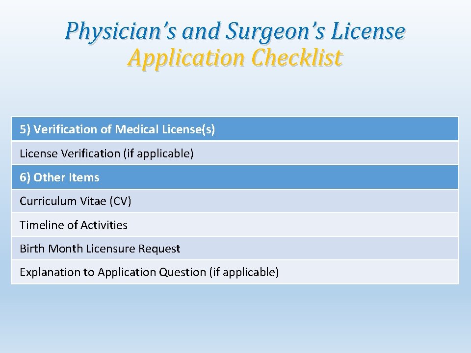 Physician’s and Surgeon’s License Application Checklist 5) Verification of Medical License(s) License Verification (if applicable) 6) Other Items Curriculum Vitae (CV) Timeline of Activities Birth Month Licensure Request Explanation to Application Question (if applicable)