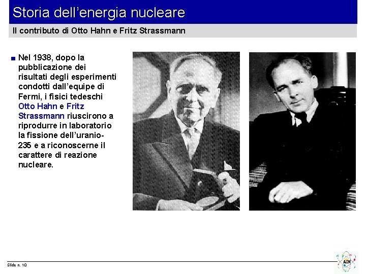 Storia dell’energia nucleare Il contributo di Otto Hahn e Fritz Strassmann ■ Nel 1938, dopo la pubblicazione dei risultati degli esperimenti condotti dall’equipe di Fermi, i fisici tedeschi Otto Hahn e Fritz Strassmann riuscirono a riprodurre in laboratorio la fissione dell’uranio 235 e a riconoscerne il carattere di reazione nucleare. Slide n. 10 AIN