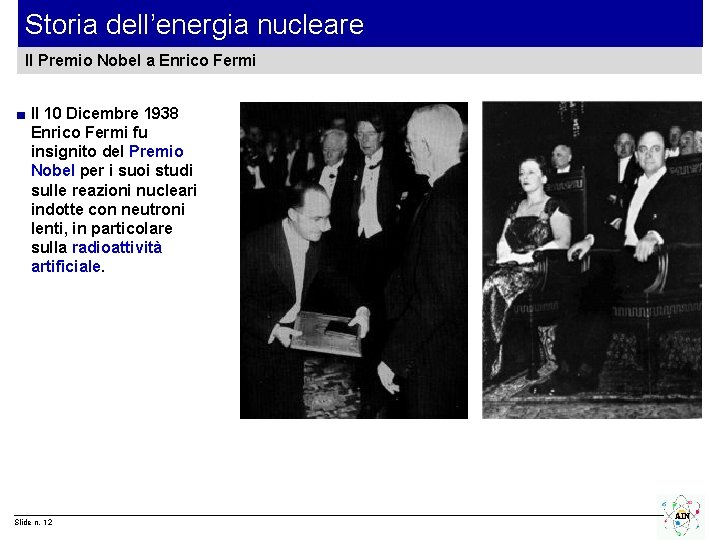 Storia dell’energia nucleare Il contributo di Lise Meitner e Otto Frisch ■ Con Hahn e Strassmann collaborava anche Lise Meitner, che dovette però abbandonare la Germania nel 1938 per sfuggire alle persecuzioni razziali. ■ Dalla Danimarca restò in corrispondenza con i colleghi tedeschi e nel 1939 diede un apporto determinante, insieme a Otto Frisch, all’interpretazione degli effetti della fissione dell’uranio in termini di liberazione di energia nucleare. ■ Nel 1939 i fisici erano dunque consapevoli della Slide n. 11 possibilità di produrre AIN