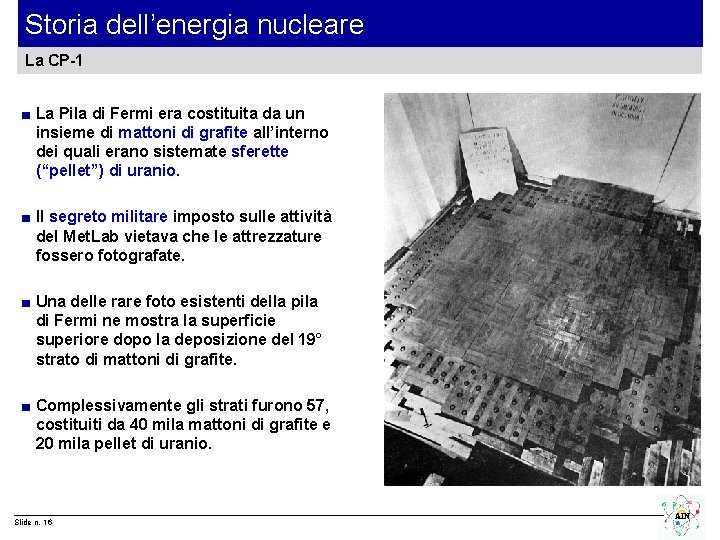 Storia dell’energia nucleare La costruzione della Chicago Pile 1 ■ Presso l’Università di Chicago Fermi diresse gli studi e i lavori di costruzione della “Chicago Pile 1” (CP-1) destinata a diventare il primo reattore nucleare della storia. ■ Le attività, coperte dal segreto militare, si svolsero nell’ambito del Metallurgical Laboratory (Met. Lab). ■ La CP-1 fu realizzata in una palestra di squash ubicata sotto le tribune dello Stagg Field, lo stadio di football dell’Università di Chicago, che fu successivamente demolito. Slide n. 15 AIN