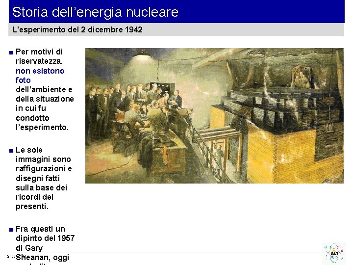 Storia dell’energia nucleare L’esperimento del 2 dicembre 1942 ■ Per motivi di riservatezza, non esistono foto dell’ambiente e della situazione in cui fu condotto l’esperimento. ■ Le sole immagini sono raffigurazioni e disegni fatti sulla base dei ricordi dei presenti. ■ Fra questi un dipinto del 1957 di Gary Slide n. 19 Sheanan, oggi AIN
