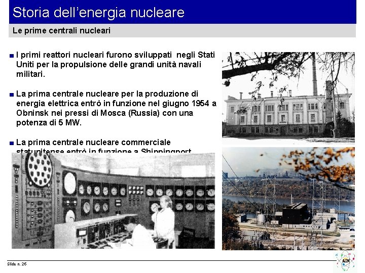 Storia dell’energia nucleare Le prime centrali nucleari ■ I primi reattori nucleari furono sviluppati negli Stati Uniti per la propulsione delle grandi unità navali militari. ■ La prima centrale nucleare per la produzione di energia elettrica entrò in funzione nel giugno 1954 a Obninsk nei pressi di Mosca (Russia) con una potenza di 5 MW. ■ La prima centrale nucleare commerciale statunitense entrò in funzione a Shippingport (Pennsylvania, USA) nel dicembre 1957 con una potenza di 50 MW. Slide n. 25 AIN