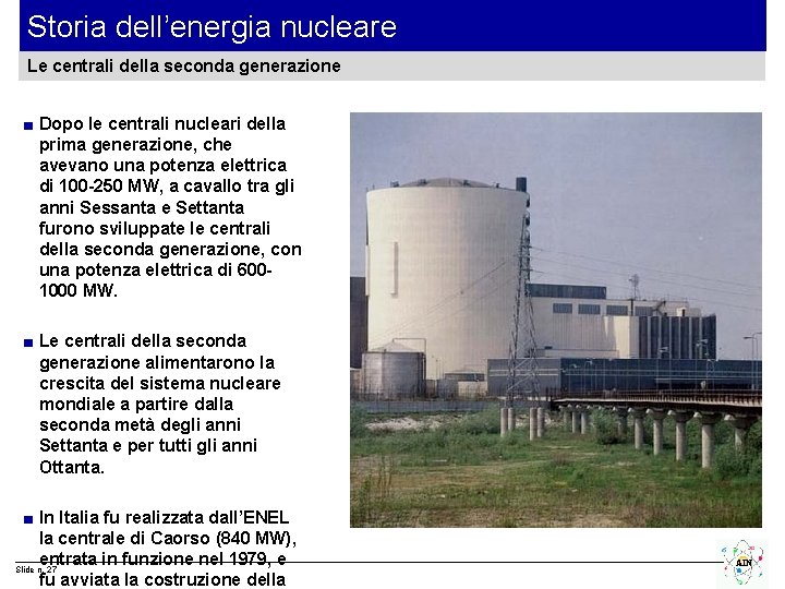 Storia dell’energia nucleare Le centrali della prima generazione ■ Alla fine degli anni Cinquanta molti paesi decisero di costruire le prime centrali nucleari. ■ In Italia furono realizzate tra il 1957 e il 1963 ■ la centrale di Trino (VC) ■ la centrale di Borgo Sabotino (LT) ■ la centrale del Garigliano (CE) ■ A metà degli anni Sessanta l’Italia era il terzo paese al mondo per potenza nucleare installata. ■ La centrale di Latina fu per alcuni anni la centrale Slide n. 26 AIN