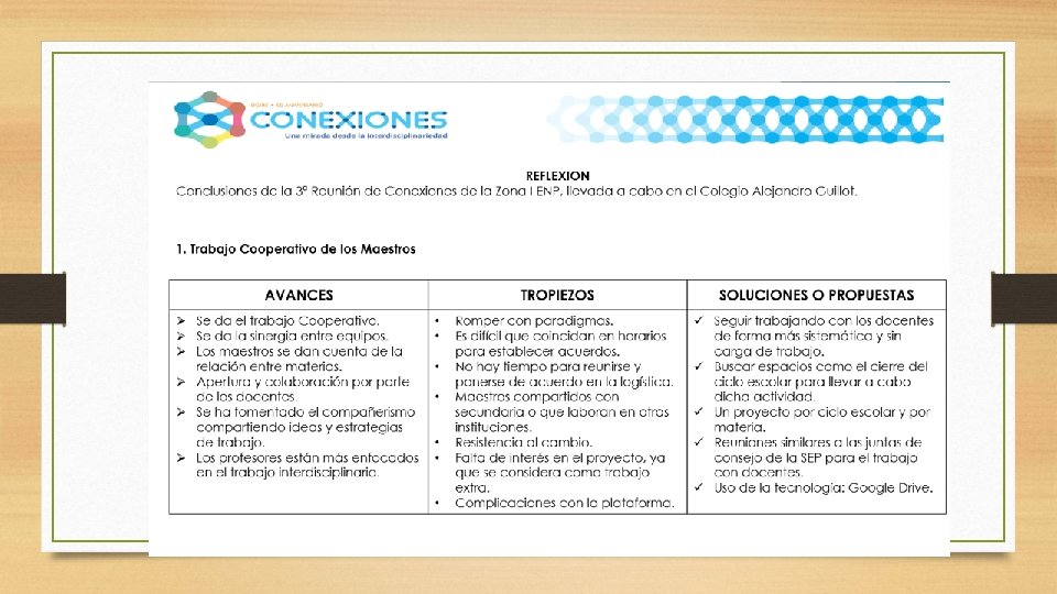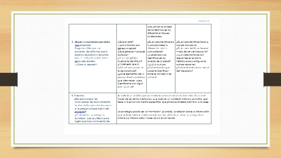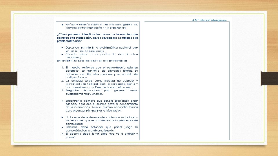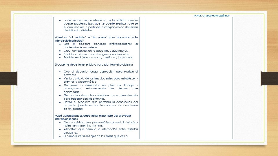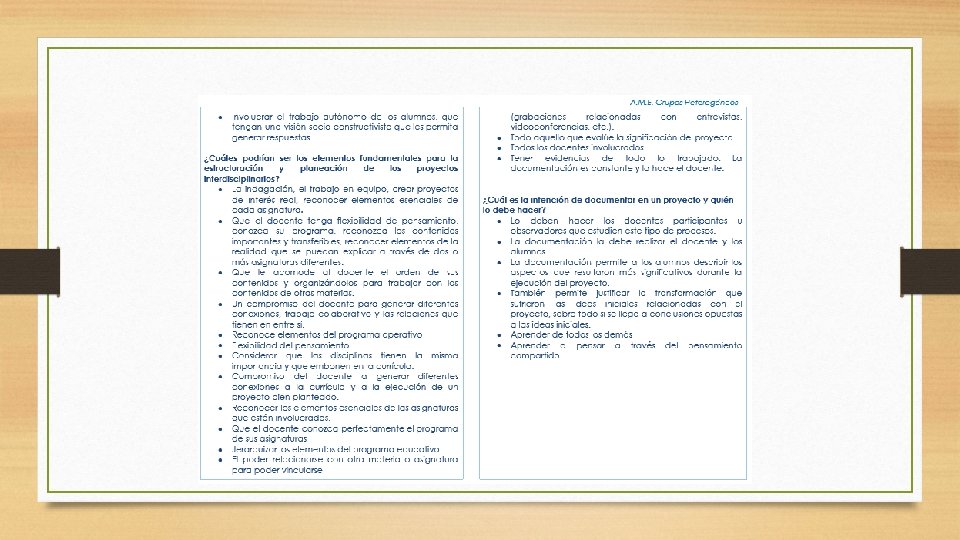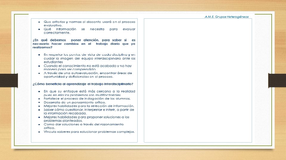 El Aprendizaje Cooperativo 1. ¿Qué es? 2. ¿Cuáles son sus Características? 3. ¿ Cuáles son sus objetivos? 4. ¿Cuáles son las acciones de planeación y acompañamiento más importantes del profesor, en éste tipo de trabajo? 5. ¿De qué manera se vincula el trabajo interdisciplinario, y el aprendizaje cooperativo? Un trabajo en conjunto en el que todos participan, por tener una meta en común. Participación activa. Participación equitativa, mantiene niveles iguales de compromiso y responsabilidad. Mayor autonomía para abordar el tema. Se asignan roles. Interdependencia positiva. Enseña habilidades sociales. Fomenta y desarrolla el pensamiento cognitivo. El aprendizaje sea del mismo nivel para todos los alumnos, basado en sus necesidades. maximizar resultados, Que se comparta la responsabilidad el aprendizaje. Favorecer las relacione socio-afectivas. Retroalimentar, verificar y evaluar el logro de los alumnos. El profesor debe integrarse en al actividades de los alumnos. Monitoreo constante. Clarificar los objetivos. El profesor debe planificar e integrar los trabajos de los grupos. Decir los objetivos claros de la actividad de aprendizaje. Conocer cómo funcionan los equipos de trabajo. En ambos se hablan de grupos de trabajos que tienen una meta en común, aunque en ocasiones su metas son diferentes. El conocimiento se potencializa en equipo. Combina lo intelectual con lo humano. Son un medio de aprendizaje empleando mano, corazón y sentimientos.