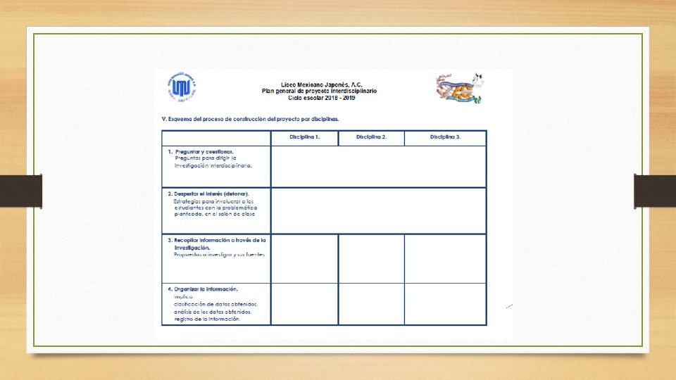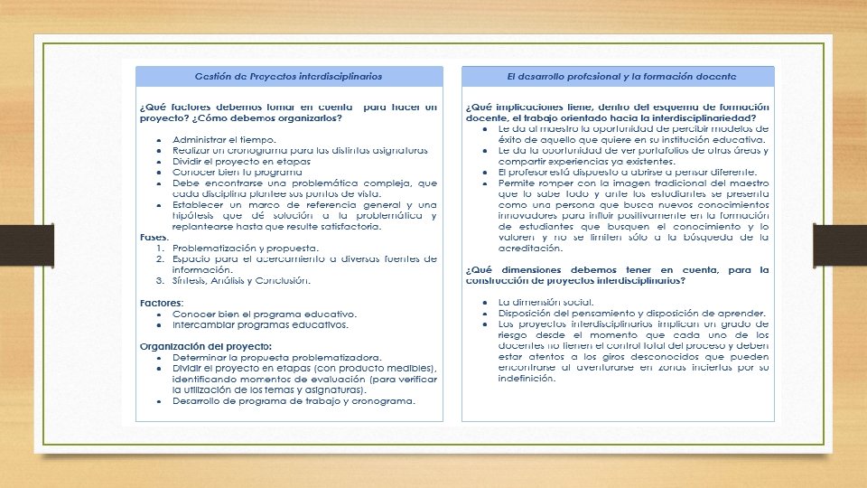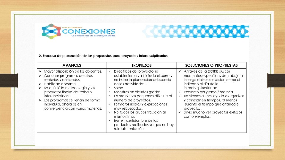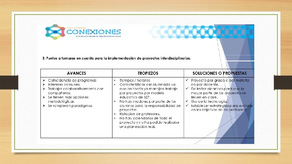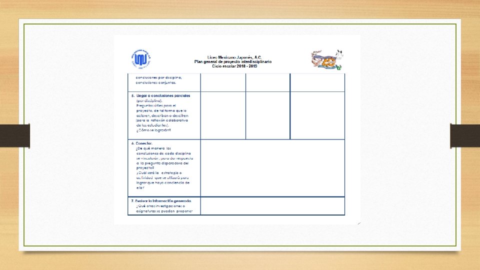5. ¿Cuáles son los prerrequisitos materiales, organizacionales y personales para la planeación del trabajo interdisciplinario? 6. ¿Qué papel juega la planeación en el trabajo interdisciplinario y qué características debe tener? Plantear un problema de interés común, formando equipos de alumnos con intereses distintos. Propiciar la comunicación, siguiendo tres niveles: 1. Articular las materias. (Revisar Programas Operativos, Contenidos y Curricular) 2. Nivel didáctico, reflexión crítica. Estudiar, analizar y sintetizar un problema. 3. Nivel pedagógico, tiempo de actualización. Tener el objetivo claro, para crear una planeación bien estructurada. Tener un espacio físico y temporal para las reuniones. Una colaboración respetuosa entre los miembros. Revisar y replantear los contenidos. (Planes de estudio) Empleo de nuevas tecnologías. Elaboración de Cronogramas de actividades, unificar tiempos e intereses; así como el apoyo de las autoridades. Evaluación continua con indicadores claros, retroalimentar y modificar. Fundamental. Basado en un modelo de enseñanza interdisciplinario. Considerar: Voluntad y responsabilidad. Implementación de una formación inicial y continua, sistemática y rigurosa de los participantes. Planeación anticipada que permita adecuaciones. Fundamentar la planeación para el logro de los objetivos, logros y evaluaciones. Optimización de recursos. La planeación debe ser incluyente metodológica, práctica y pedagógica.