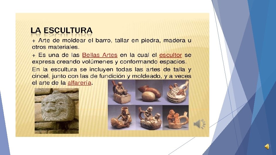 Escultura Se llama escultura al arte de moldear el barro, tallar en piedra, madera u otros materiales, figuras en volumen