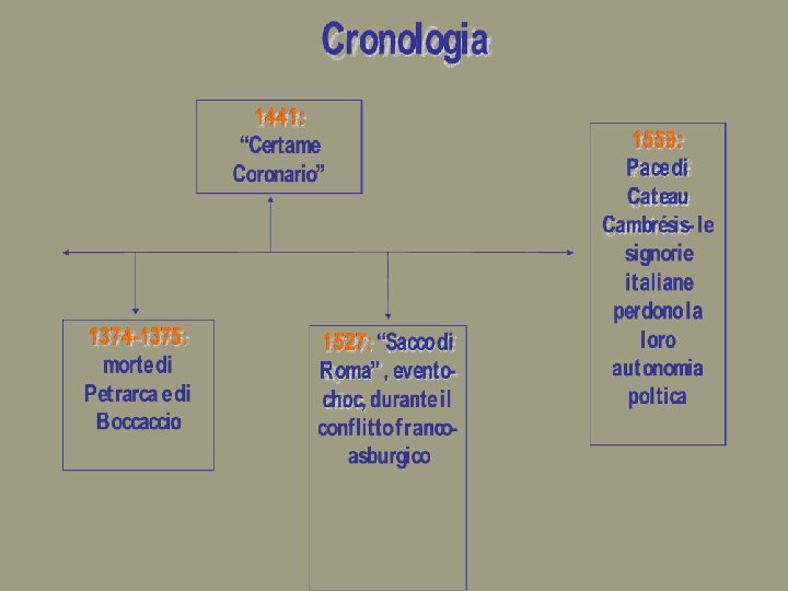 Cronologia: la fine dell’Umanesimo← Carlo. Rinascimento V La crisi dell’Umanesimo- ↓ Francesco I Rinascimento comincia durante il conflitto francoasburgico, quando la Francia di Francesco I e la Spagna di Carlo V si contesero il predominio in Italia. Un evento-choc che mise in crisi l’ottimismo rinascimentale sulle capacità dell’uomo di dominare il corso degli eventi fu il «Sacco di Roma» del 1527, a cui seguì la Pace di Cateau -Cambrésis del 1559, 1559 in seguito alla quale le Signorie italiane persero la loro autonomia.