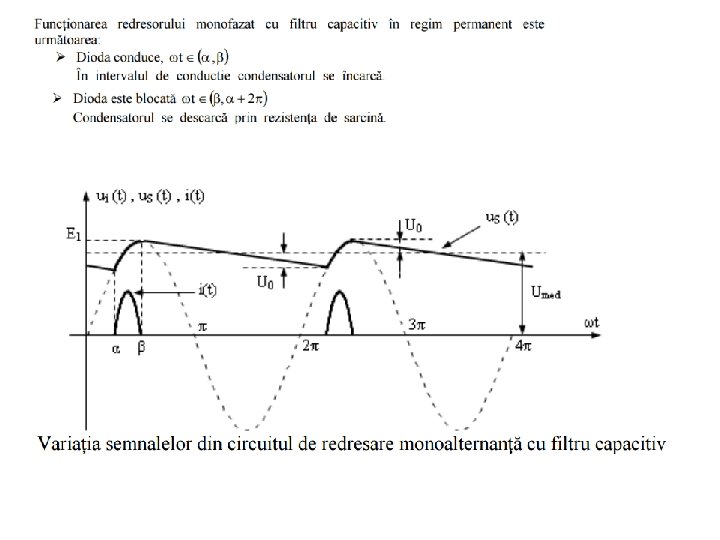 Redresorul monoalternanţă cu filtru capacitiv D i. S Tr r 1 r 2 u 1 u 2 N 1 Cf u. S Rs N 2 • Condensatorul înmagazineză energie în intervalul în care dioda conduce şi cedează energie sarcinii atunci când dioda este blocată. În aceste condiţii, timpul cât curentul trece prin sarcină creşte, iar ondulaţiile se reduc.