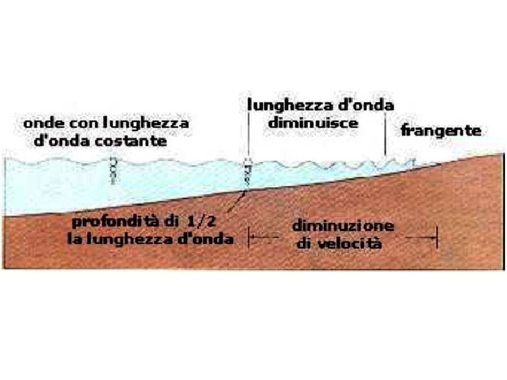 • Dove non si sente l’influenza dei fondali, si hanno le onde di oscillazione Il movimento dell’acqua si propaga agli strati inferiori e, mano che si procede verso il basso, questo movimento si esaurisce (ciò avviene ad un profondità pari a ½ della lunghezza d’onda). d’onda Vicino alla costa, quando la profondità diventa uguale a ½ della lunghezza d’onda, le particelle d’acqua iniziano a sfregare sul fondo e vengono rallentate dall’attrito. Le particelle superficiali sono più veloci e “sorpassano” quelle inferiori, formando le onde di traslazione Presso la riva, le onde si ribaltano, dando luogo ai frangenti