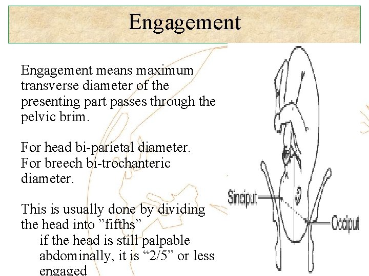 Engagement means maximum transverse diameter of the presenting part passes through the pelvic brim. For head bi-parietal diameter. For breech bi-trochanteric diameter. This is usually done by dividing the head into ”fifths” if the head is still palpable abdominally, it is “ 2/5” or less engaged