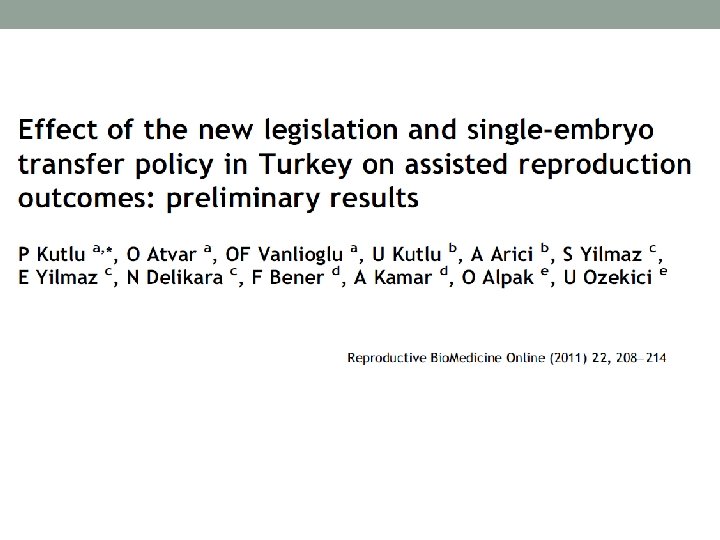 Before and after study • All fresh IVF cycles done in Istanbul EUROFERTIL IVF Center between January 2009 – December 2010 • 775 cycles done before and 502 cycles done after regulation. • All stimulations started at 2 nd-3 rd day of menstruation used FSH or HMG in dosis 150 -300 IU depends the age and the antral follicle count of the patient. • An antagonist were added at the 6 th day of stimulation until day of HCG. • 10. 000 IU HCG were given if at least 3 follicles are above 17 mm, except poor responders. • Oocyte retrieval was done 36 hours after HCG injection. • Luteal phase was supported only with Progesteron.