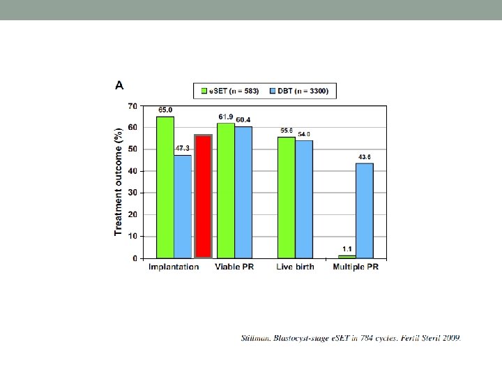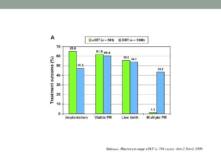 Before and after study Cycle Age Number of oocytes Fertilisation rate % Blastocyste transfer rate % # of transferred embryos SET rate % * P<0. 05 Before legislation 775 30, 8 8, 8 62, 8 1, 5 2, 4 23, 5 After legislation 502 31, 7 6, 9* 67, 6* 16, 3* 1, 3* 67, 4*