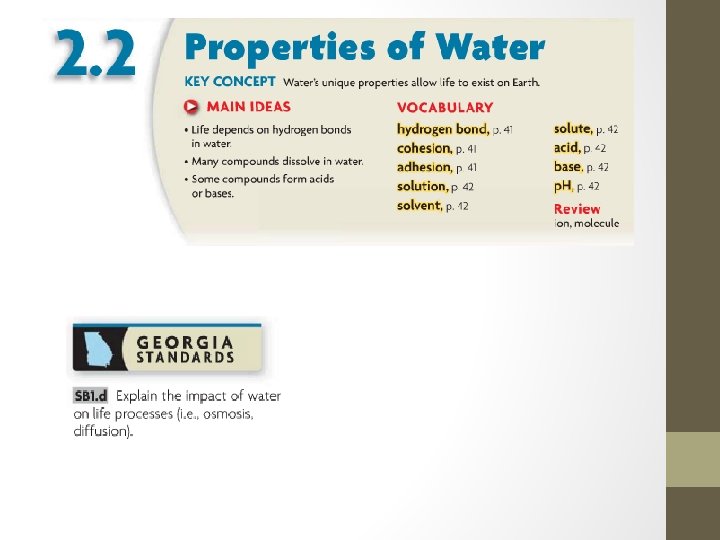 Cohesion + Adhesion = Capillary Action • Cohesion and adhesion work together to give capillarity – the ability of water to spread through fine pores or to move upward through narrow tubes against the force of gravity. • Cohesion due to hydrogen bonding contributes to the transport of water and dissolved nutrients against gravity in plants. Adhesion of water to cell walls by hydrogen bonds helps to counter the downward pull of gravity on the liquids passing through plants Significance: The process of water moving through plants against the force of gravity. • •