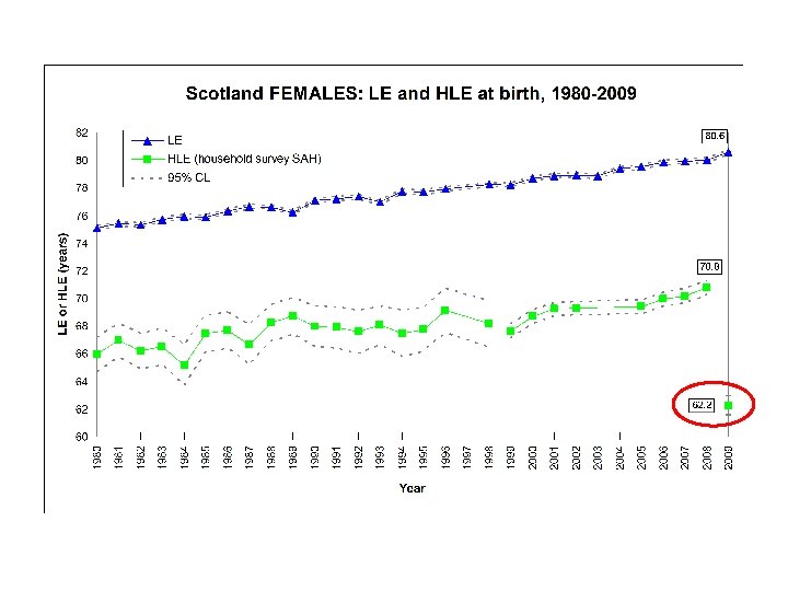 HLE in Scotland 1. With time… LE HLE years in ‘not healthy’ health (% life in ‘not healthy’ health unchanged) 2. With increasing deprivation (and urbanisation)… LE HLE years or % of life in ‘not healthy’ health 3. Internationally… Scot lower LE than most W European countries (and apparently lower DFLE at birth than many).