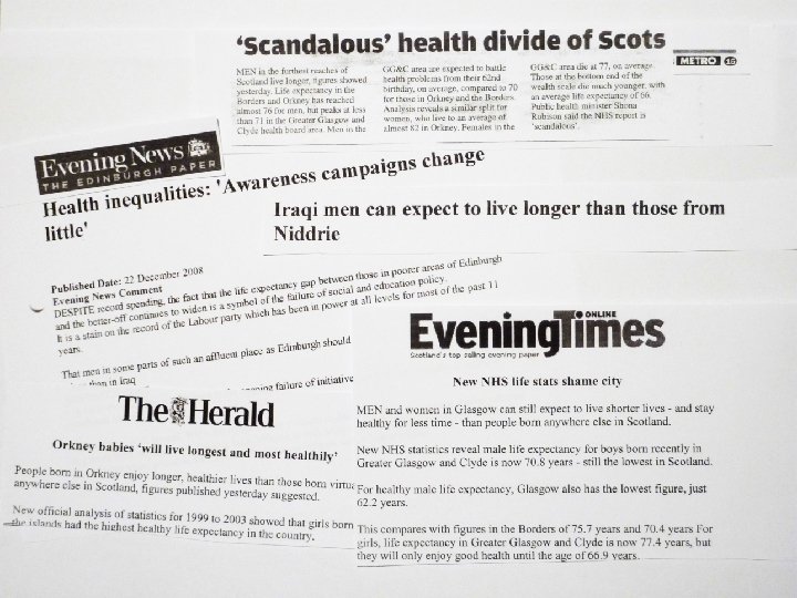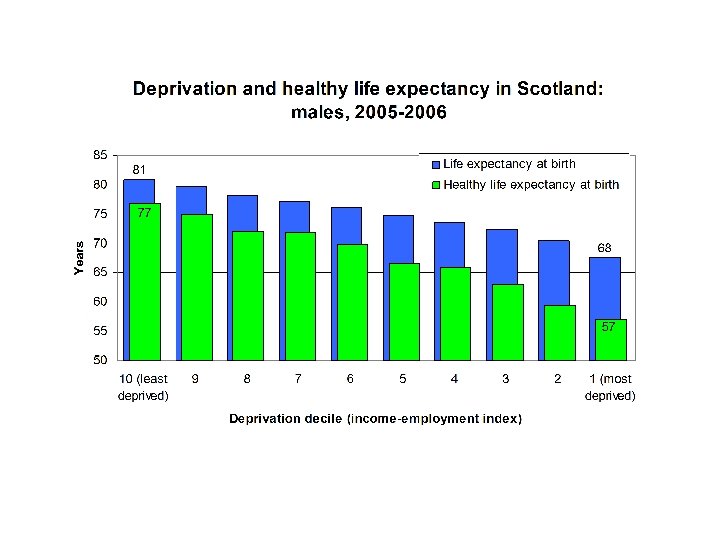 Edinburgh: LE at birth, 2003 -2007 Barnton/Cammo area Greendykes/Niddrie Mains area Males 85. 5 years (82. 4 -88. 5) Males 61. 1 years (57. 3 -65. 0) Females 90. 4 years (88. 6 -92. 2) Females 73. 7 years (69. 5 -78. 0)