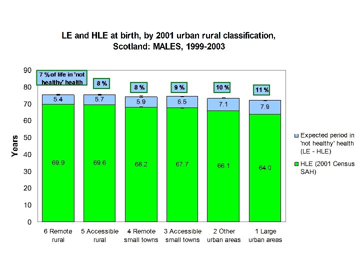 HLE in Scotland With increasing deprivation (and urbanisation) LE HLE years or % life in ‘not healthy’ health