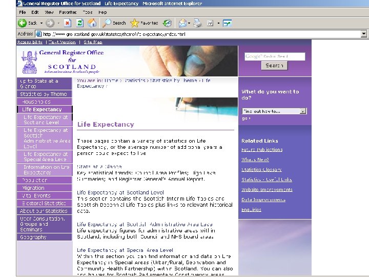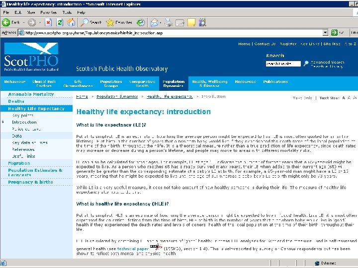 Life expectancy (LE) and Healthy life expectancy (HLE) • • • Definitions Scotland data and changes over time Methodology and pitfalls Variations within Scotland compared to other countries