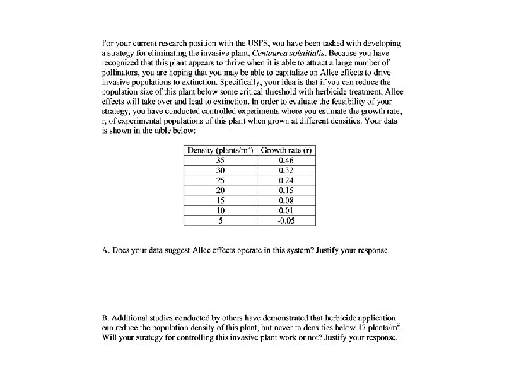 -Practice question -In order to identify the importance of density regulation in a population of wild tigers, you assembled a data set drawn from a single population for which the population size and growth rate are known over a ten year period. This data is shown below. Does this data suggest population growth in this tiger population is density dependent? Why or why not? Year Population size Growth rate, r 1987 126 -0. 11905 1988 111 -0. 09009 1989 101 -0. 11881 1990 89 -0. 26966 1991 65 -0. 29231 1992 46 -0. 19565 1993 37 0. 459459 1994 54 0. 240741 1995 67 0. 179104 1996 79 0. 025316 1997 81 0. 185185 1998 96 0. 16 -What problems do you see with using this data to draw conclusions about density dependence?