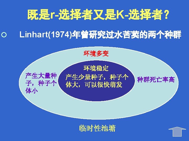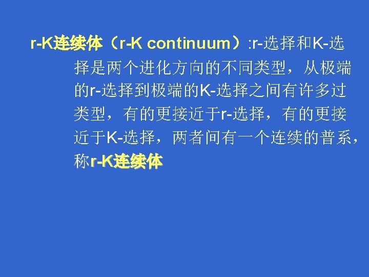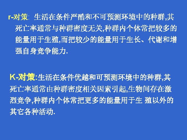 Two distinct life history strategies: r-selection theory r- and Kselection K-selection theory r- selected : maximize the rate of increase of the population size K-selected : adapt to be competitive. 两种明显的生活史对策: r-选择和K-选择理论 r -选择和 K-选择 r-选择: 种群增长率最大 K-选择: 竞争性强。
