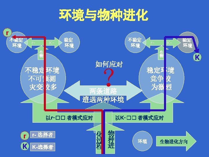 r-strategy species: rapid development, small adults, r- and Kselection many and small offspring and a short generation time. K-strategy species: slow development, large adult size, few, large offspring and long generation times. r-对策种类: 发育快,成体小,后代数量多但体积小, 世代时间短。 r -选择和 K-选择 K-对策种类: 发育慢,成体大,后代数量少但体积大, 世代时间长。