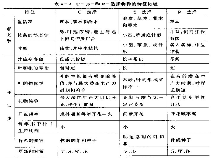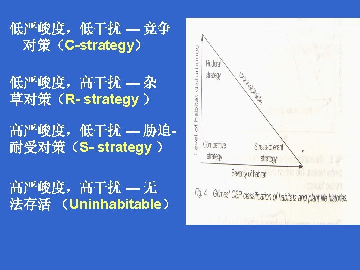 C- strategy, S- strategy and R- strategy Grime’s ‘CSR triangle’ classifies habitats from a perspective of plant life history, using the degree of habitat disturbance (or stability) and its severity to plants. Grime的“CSR三角形”从植物生活史的观点,利用 生境干扰(或稳定)程度及其对植物的严峻性来划分 生境。